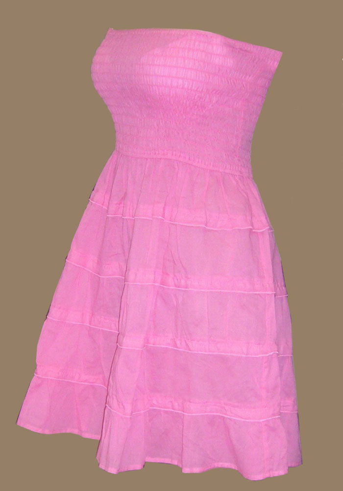 Туника выполнена из хлопчатобумажного полотна. Верхняя часть туники прострочена эластичными нитями, что позволяет фиксировать тунику на фигуре без бретелей. Нижняя часть состоит из пяти воланов, которые делают юбку пышной, расширенной книзу.