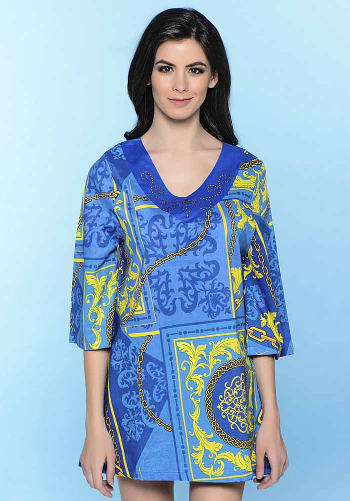 Пляжное платье свободного силуэта с V-образным вырезом. Детали платья выполнены из принтованного хлопкового полотна. По линии горловины обработана фигурная деталь из однотонного хлопкового полотна, декорированная термоаппликацией из металлических элементов. Рукав длиной 3/4 имеет небольшое расширение к низу.