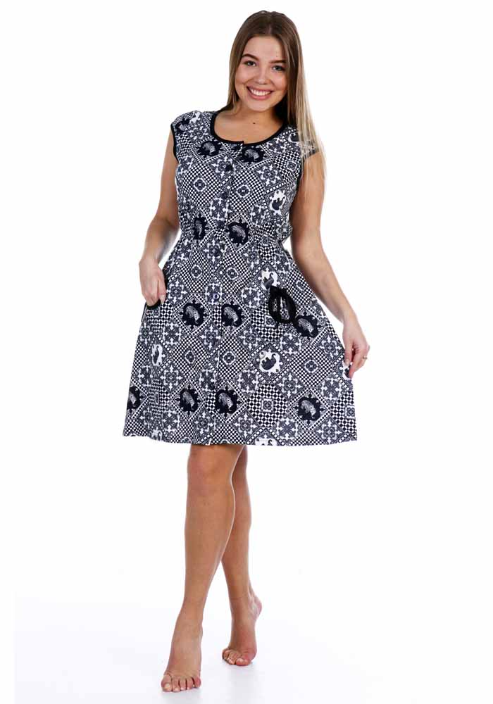 Халат с двумя карманами из яркой набивной ткани. Резинка на талии.