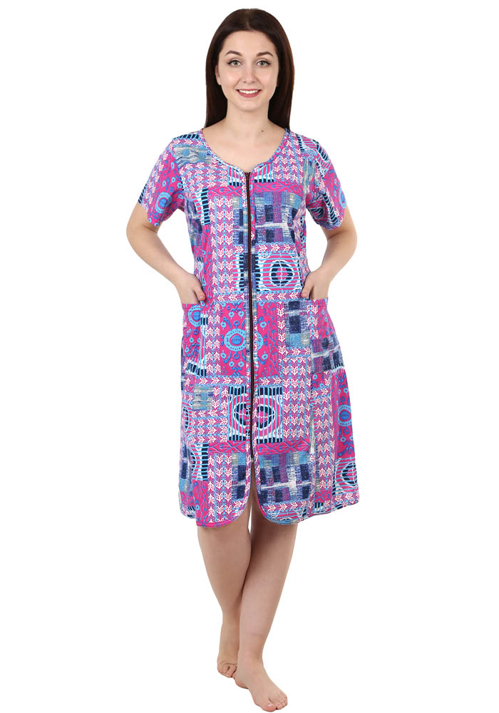 Халат из набивного полотна прямого свободного силуэта с коротким втачным рукавом. На молнии. Спереди накладные карманы. Круглая горловина обработана обтачкой. Низ изделия и низ рукавов обработан швом «в подгибку».