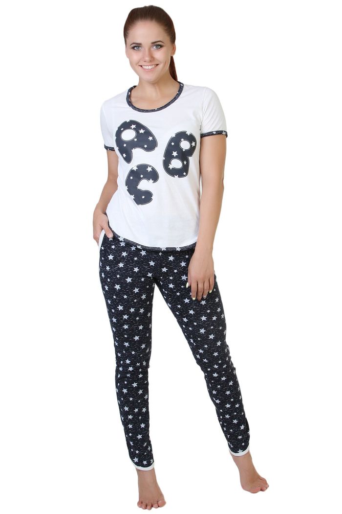 Комплект (пижама) женский "ABC" состоит из футболки и брюк. Футболка с принтом. Круглый вырез горловины, рукав короткий втачной. Горловина, низ рукавов и низ изделия окантованы. На полочке принт. Брюки из набивного полотна с карманами, зауженные, верх на резинке. Вход в карманы и низ брюк окантованы.
