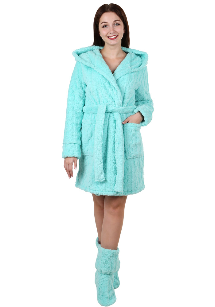 Халат запашной с капюшоном длиной выше колена, двумя накладными карманами. Рукава длинные втачные с манжетами. Рельеф-ная стрижка полотна велсофта выполнена в виде жаккардового рисунка – косички.