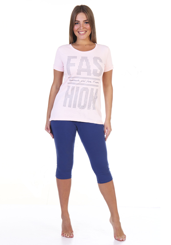 Костюм состоит из бридж и футболки. Бриджи на резинке. Футболка удлиненная сзади.