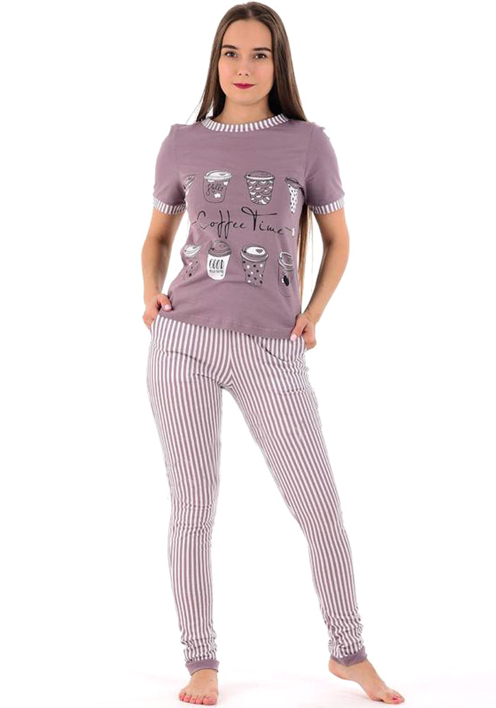 Женский домашний комплект. Футболка с рисунком и брюки в полоску с карманами.