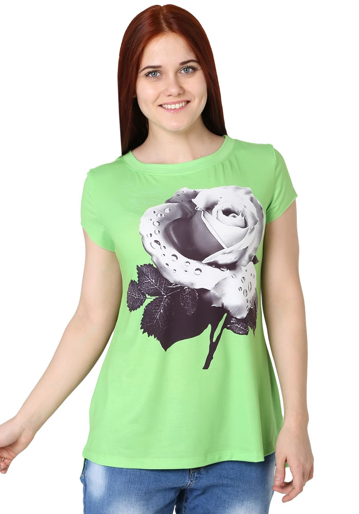Блузка полуприлегающего силуэта. Рукава втачные короткие. Горловина обработана бейкой. На полочке принт. По боковым швам разрезы. Перед короче спинки.