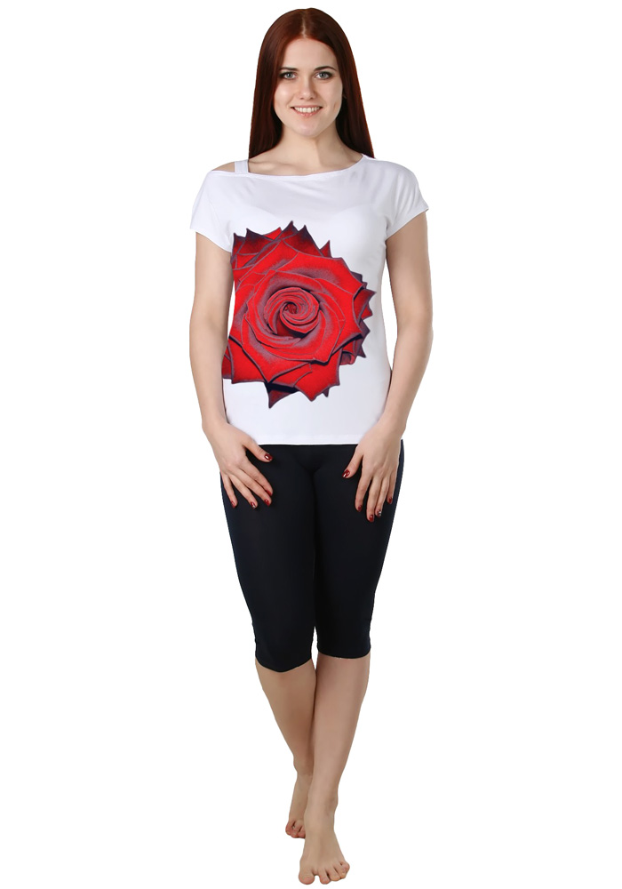 Костюм женский состоит из блузки и бридж. Блузка женская полуприлегающего силуэта с цельнокроеным рукавом и ассиметрич-ным вырезом горловины с одной бретелью на плече. На полочке принт. Бриджи обле-гающие из набивного полотна, верх на ре-зинке.