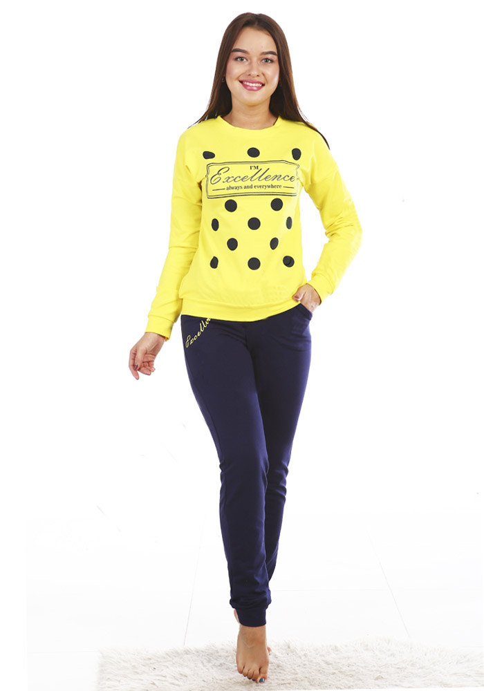 Женский комплект состоит из толстовки и брюк на манжетах снизу.