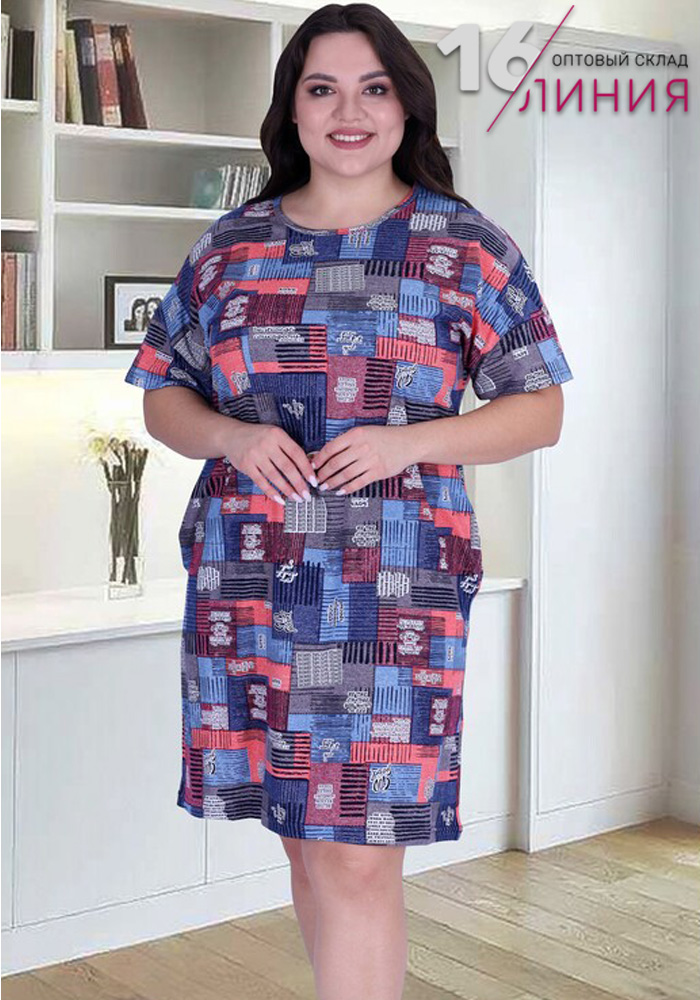 Женская туника из принтованного полотна. По бокам втачные карманы.