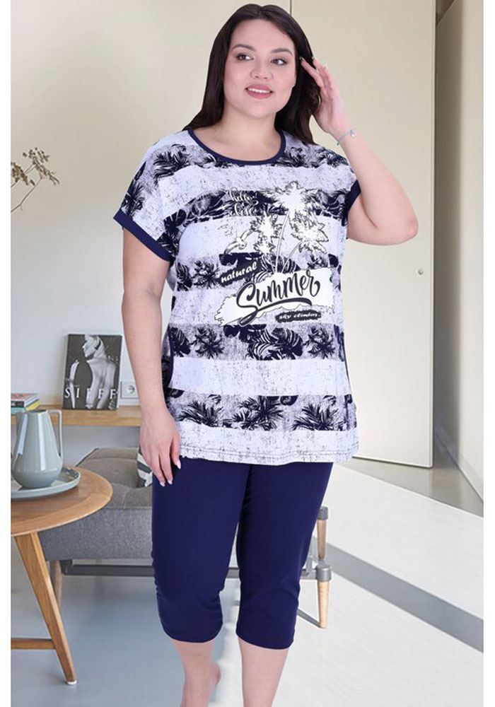 Женский комплект. Футболка выполнена из принтованного полотна, спереди украшена рисунком. Бриджи выполнены из однотонной ткани.