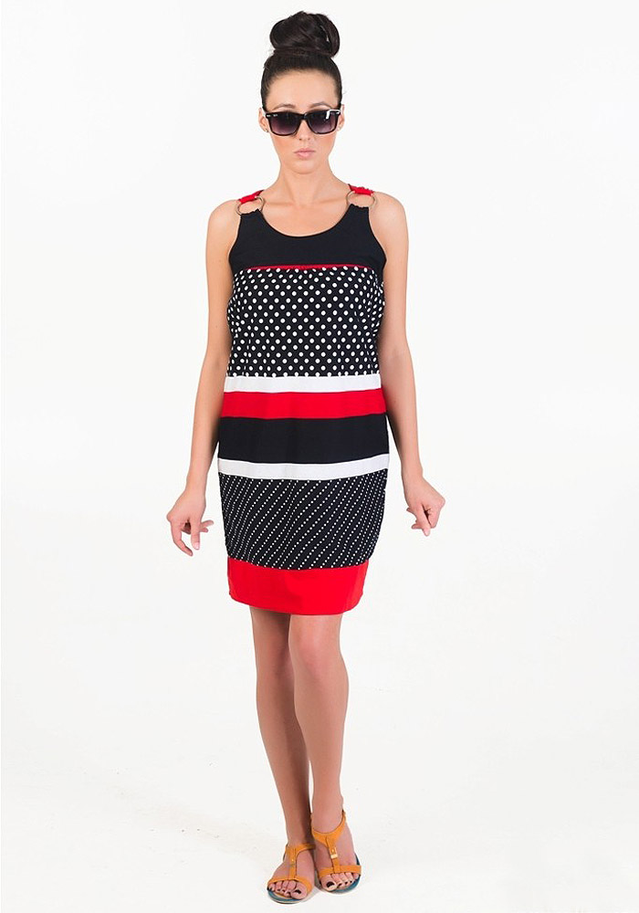 Сарафан на широких бретелях и кольцах выполнен из кулирки купонного рисунка "полоса + горох". Низ сарафана оформлен на широком манжете.