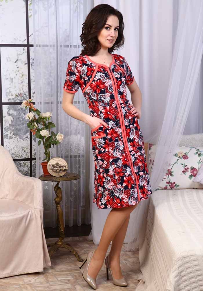 Халат с коротким рукавом на молнии и с карманами. Воротник отсутствует.
