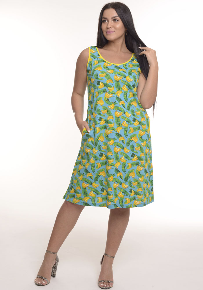 Летний сарафан. Широкие бретели. Горловина и вход в карман окантованы яркой отделочной тканью. Карманы