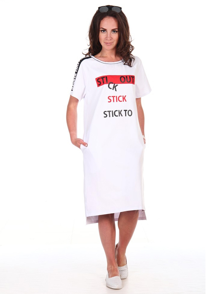 Платье женское прямого силуэта, длиной чуть ниже колена, спинка чуть длиннее. Спинка и перёд без особенностей. Рукав – «реглан», короткий. Боковые швы заканчиваются разрезами. На полочке и одном рукаве – печать. Особенностью модели является оригинальная обработка горловины – разрезанная окантовка с кантом. Платье выполнено из трикотажного полотна высшего качества «пенье».