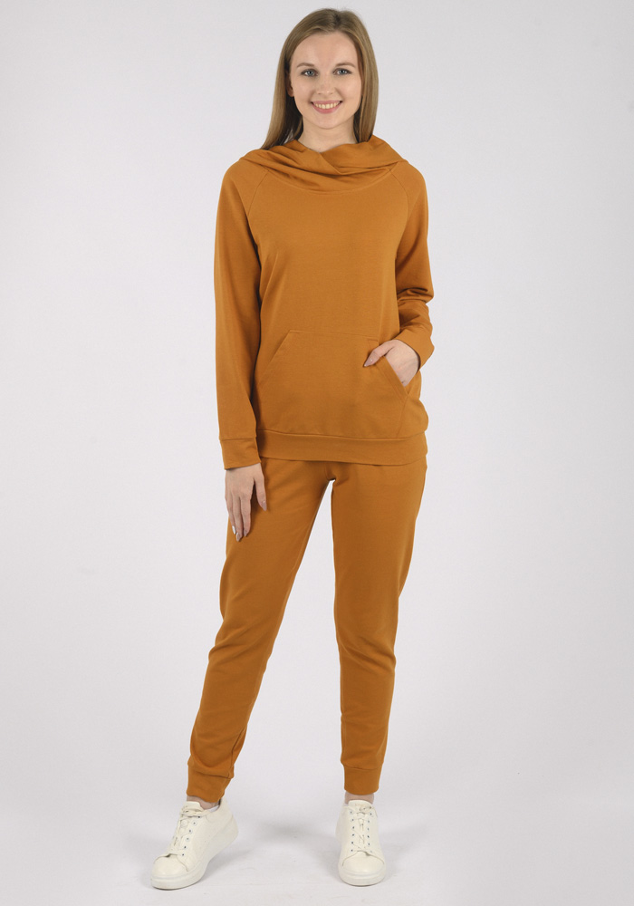 Стильный молодежный однотонный костюм.Толстовка полуприлегающего силуэта. Рукав длинный, реглан, на манжете. Декоративный капюшон. Карман в стиле "кенгуру". Низ изделия на поясе. Брюки полуприлегающего силуэта , внизу на манжете. Прорезные карманы. Пояс на резинке. Правильная посадка