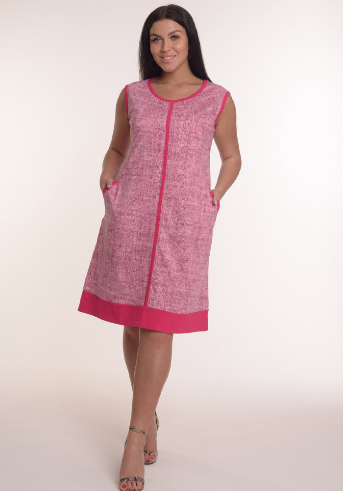 Стильный летний сарафан полуприлегающего силуэта. Широкие бретели. Круглый вырез. Отделка контрастной тканью. Прорезные карманы. Классическая длина.