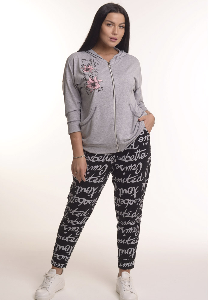 Стильный костюм состоит из толстовки и брюк. Толстовка прямого покоя на молнии. Рукав втачной длиной 7/8 с манжетами по низу. Удлиненное плечо. Длина до линии бедер с поясом. Капюшон. Боковые карманы в стиле "кенгуру". Швы толстовки украшены отделочными трикотажными строчками. Дизайнерские оригинальные принты. Брюки длиной 7/8, объемные с манжетами по низу. Боковые карманы. Пояс на резинке