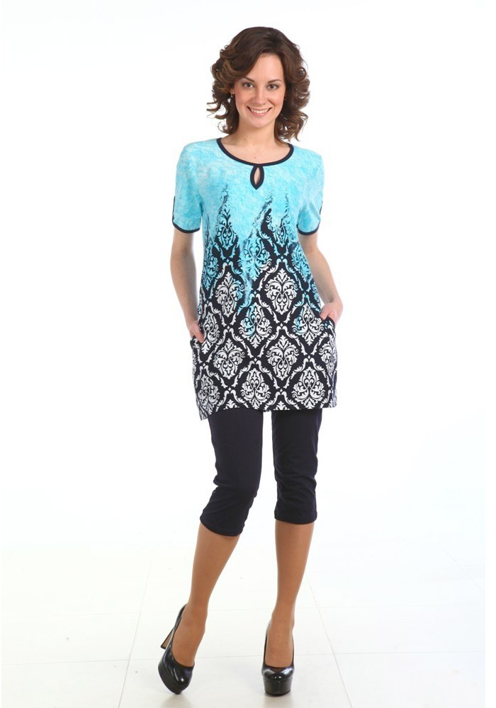 Костюм женский из кулирного полотна. Футболка из набивной кулирки новых коллекций c купонным рисунком, с декоративным оформлением горловины и низа рукава. Бриджи из кулирки с лайкрой, с декоративным оформлением низа.