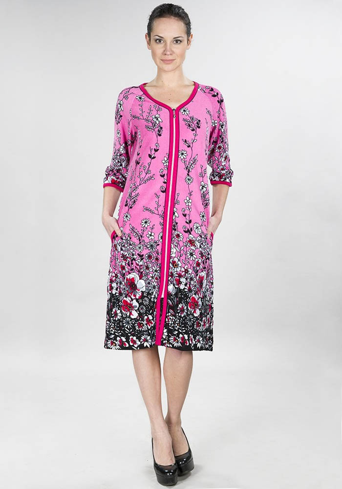 Халат женский выполнен из петельчатой махры с купонным цветочным рисунком. Расцветки: розовая, голубая, бирюзовая. Застежка на молнии, внутренние карманы, без воротника, рукав кроя регалан, длиной 3/4. Отделка халата двойным кантом контрастных цветов. Удобен для холодного сезона.
