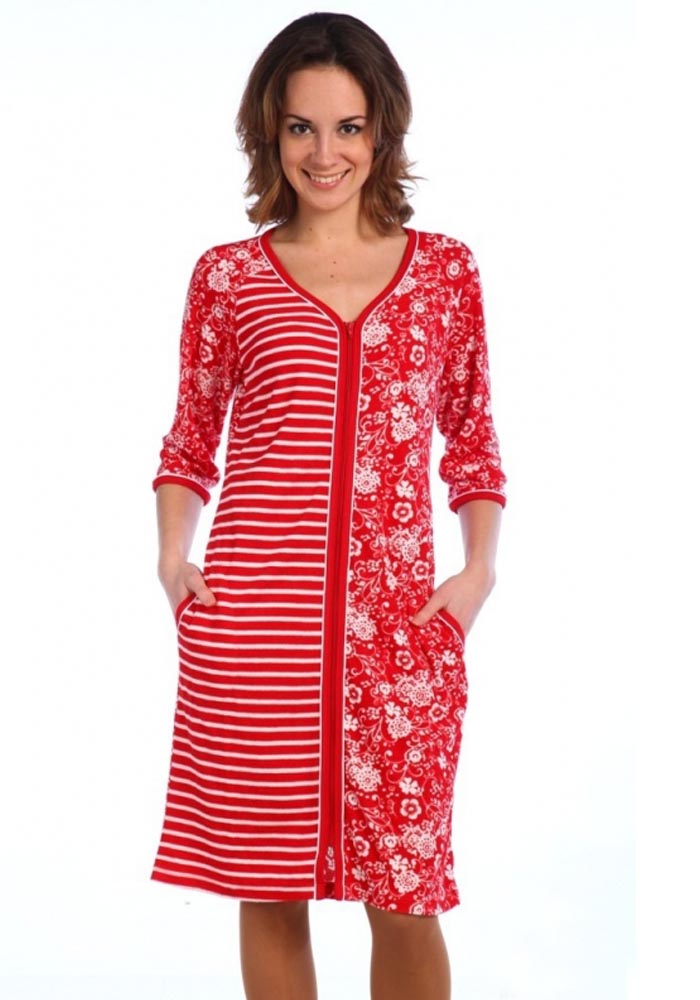 Классический халат прямого силуэта выполнен на молнии, с карманами, рукавами 3/4 длины, с окантовой контрастного цвета. Удобный вариант для повседневного пользования, так как изготовлен из трикотажного полотна содержанием 80% хлопка - петельчатой махры.