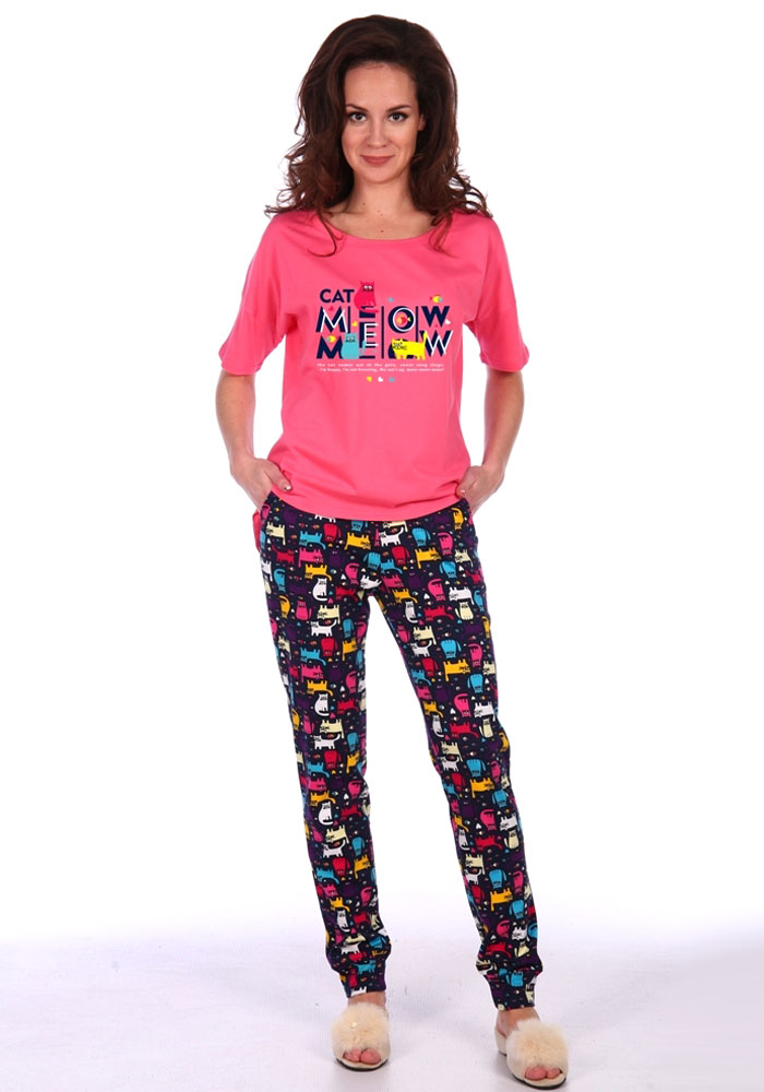 Женская костюм для дома. Фтутболка украшена рисунком, брюки выполнены из принтованного полотна.