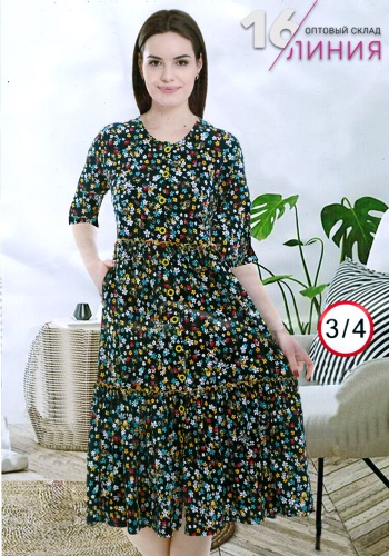 Женский халат на пуговицах. Рукава 3/4. Выполнен из принтованного полотна с цветочным узором.