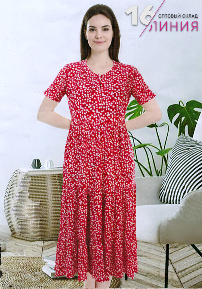 Женское платье. Выполнено из принтованного полотна. Низ платья волнистый. Короткий рукав.