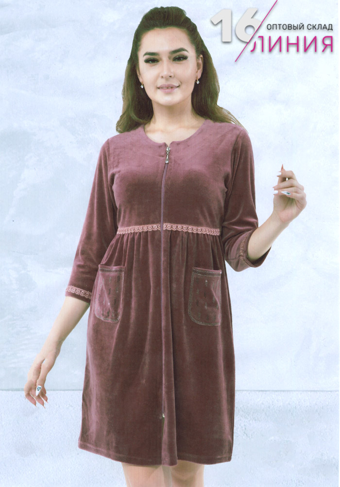 Женский халат на молнии. Длина выше колен. Спереди накладные карманы.