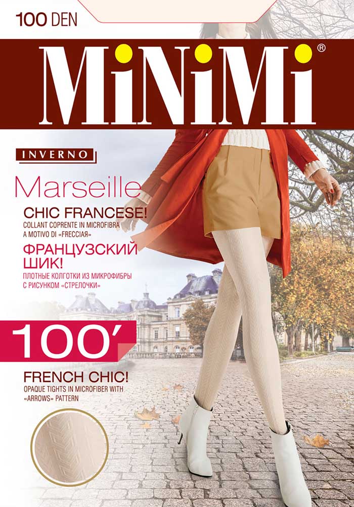 Непрозрачные фантазийные колготки из эластичной микрофибры, плотностью 100 ден, с комфортным широким поясом, гигиеничной ластовицей и плоскими швами. Вся нога модели украшена рельефным узором "вертикальные зигзаги".