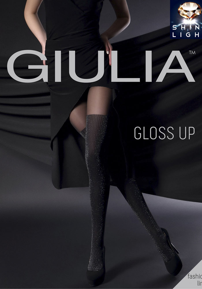Фантазийные колготки с оплетенным эластаном, плотностью 60 ден, с широким комфортным поясом, ластовицей и плоским швом. У модели прозрачный верх, а снизу имитация плотных ботфортов "в полоску" с блестящим люрексом.