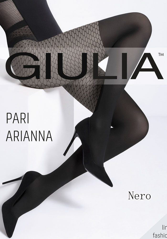Матовые фантазийные колготки с оплетенным эластаном, плотностью 60 ден, с ластовицей, широким поясом и усиленными плоскими швами. Верхняя часть модели украшена тканым узором "сетка", снизу имитация непрозрачных ботфортов.