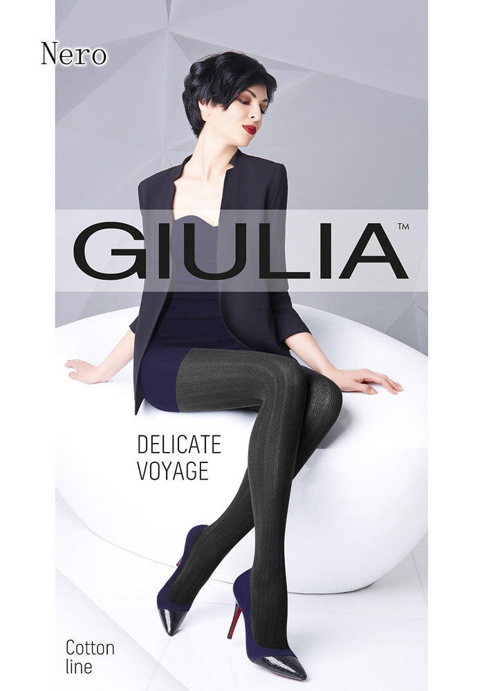 Хлопковые фантазийные колготки с эффектом тюля и оплетенным эластаном, плотностью 150 ден, с укрепленным мыском, ластовицей, широким поясом и плоским швом. По всей ноге модели размещен рельефный узор в виде полосок и уголков.