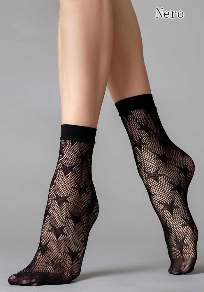 Ажурные фантазийные носки с узором "звездочки". У модели укрепленный мысок и комфортная резинка. Носки цветные, доступна обширная гамма оттенков.
