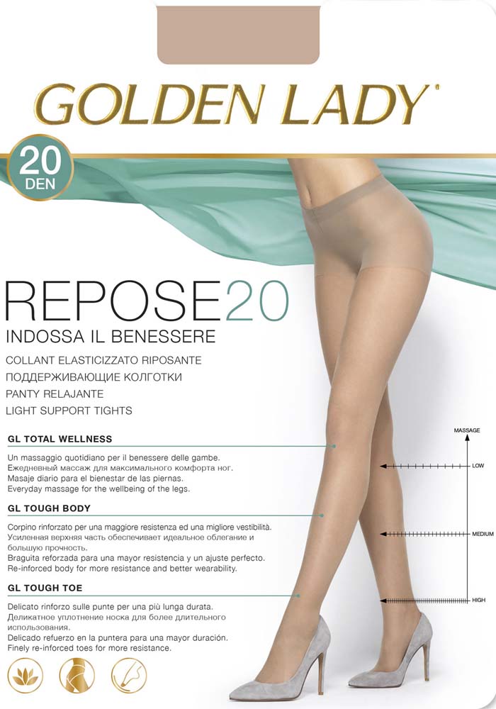 Тонкие шелковистые колготки плотностью 20 ден, с массажным эффектом, уплотненными шортиками и усиленным мыском.