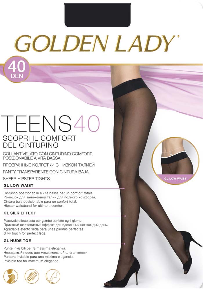 Колготки с заниженной талией, с лайкрой, плотностью 40 ден, с ластовицей и укрепленным носком.