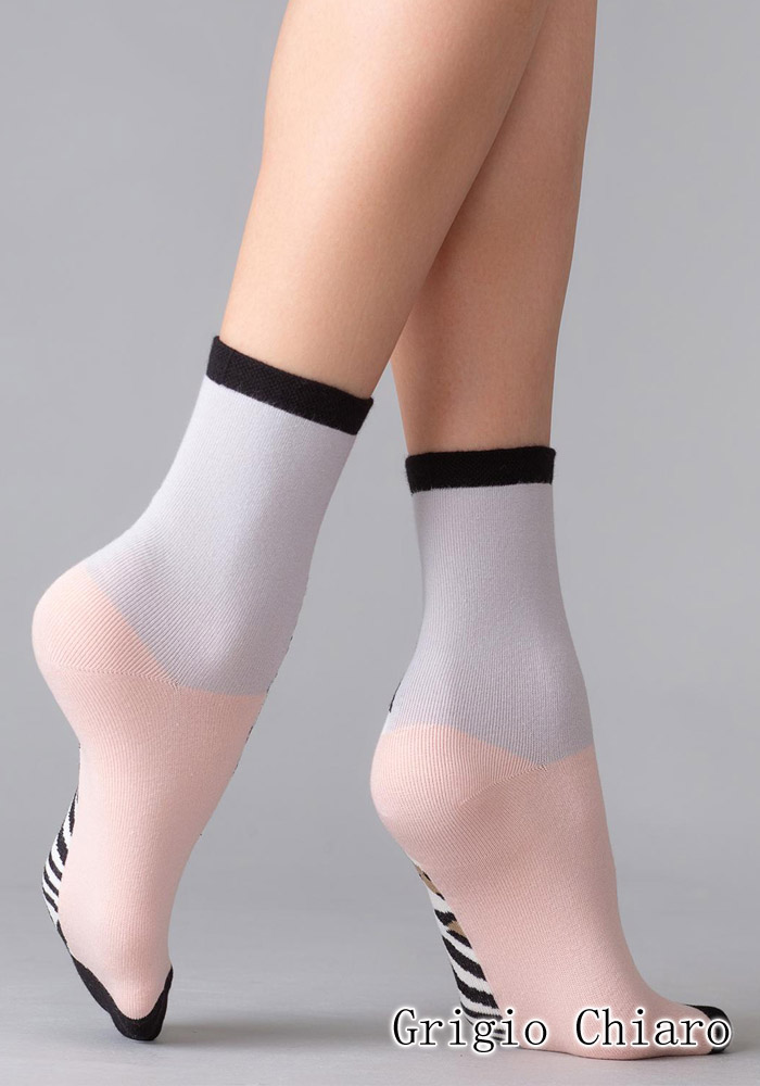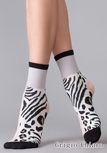 Хлопковые женские носки с комфортной резинкой и кеттельным швом. Контрастный дизайн модели из цветных блоков эффектно дополнен анималистичным принтом на нижней части фронта.