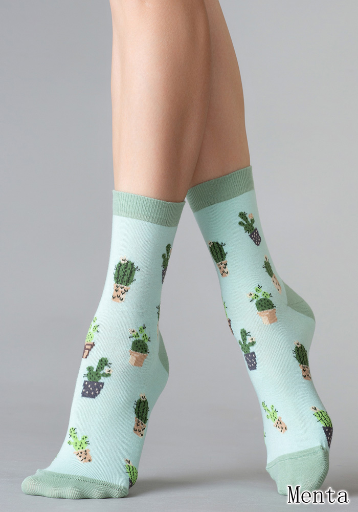 Хлопковые женские носки с комфортной резинкой и кеттельным швом. Модель декорирована ярким рисунком в виде кактусов.