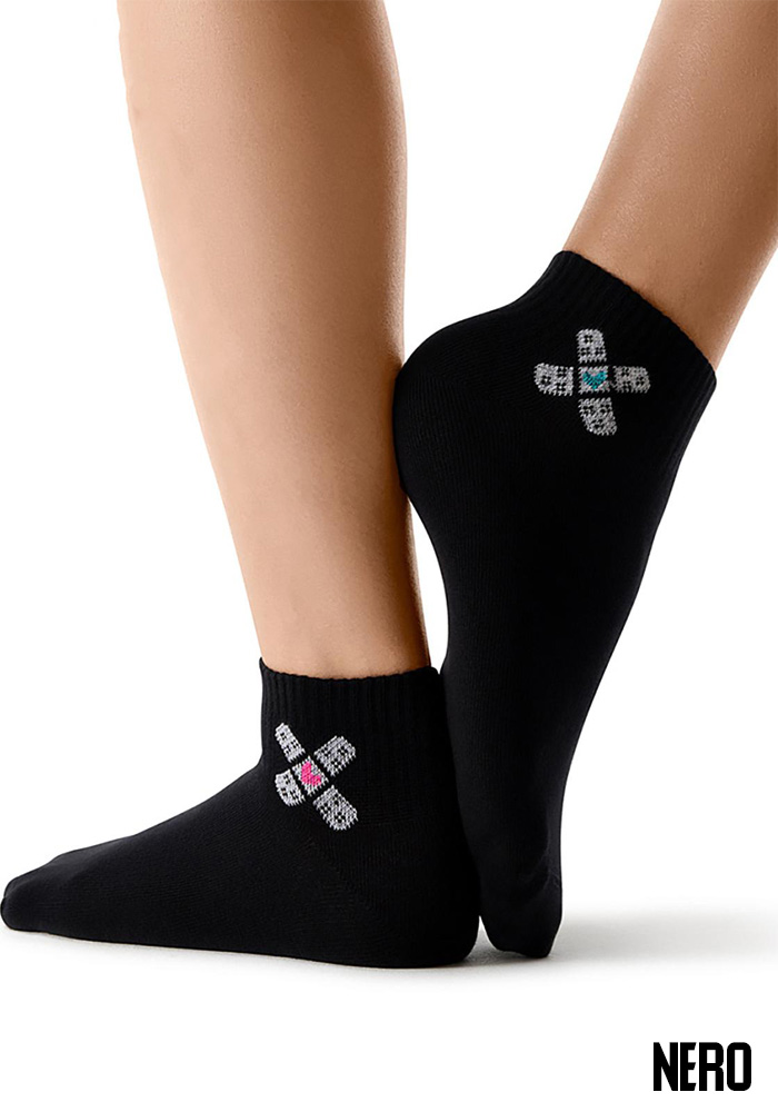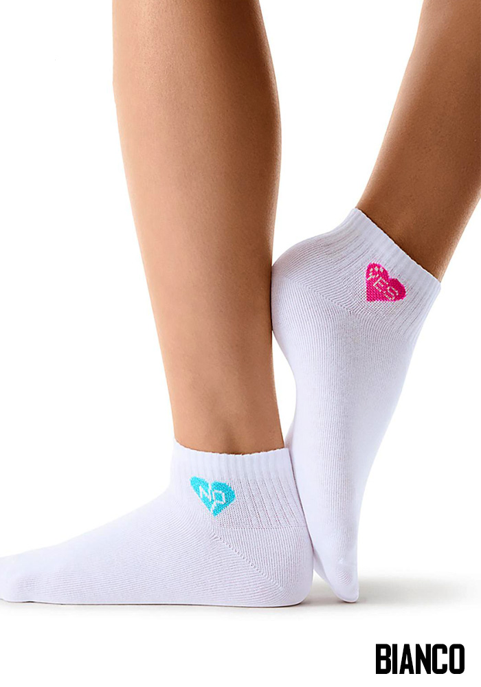 Укороченные женские носки с рисунком "Love Story" на паголенке. Выполнены из высококачественного и мягкого хлопка, который отлично пропускает воздух, впитывает влагу и подходит для чувствительной и нежной кожи. Добавление эластана и полиамида увеличивает износостойкость и прочность. Удобная резинка "в рубчик" превосходно облегает, а кеттельный (плоский) шов на мыске обеспечивает дополнительный комфорт.